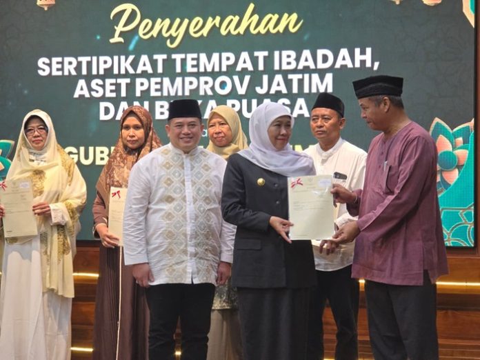 “Sertifikasi tanah ini bukan sekadar administratif, tetapi memastikan bahwa hak masyarakat dan lembaga yang berdiri di atas tanah tersebut memiliki perlindungan hukum yang kuat,” ujar Khofifah dalam acara penyerahan sertifikat tanah wakaf dan tempat ibadah.